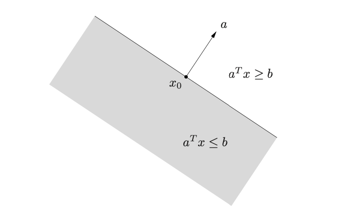 즉, Halfspace는 Hyperplane보다 아래쪽(위쪽)에 있는 점들의 집합들을 의미하며, convex set이다. (affine set은 아님)
