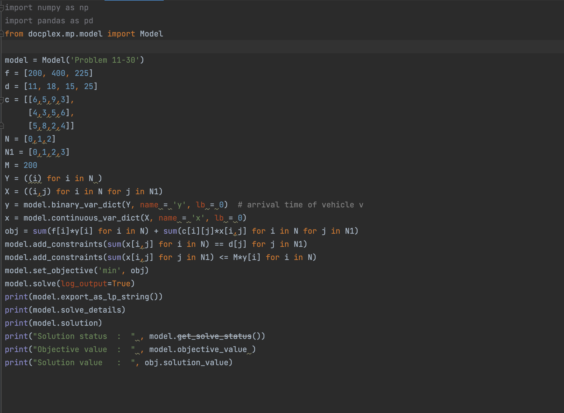 model.add_constraints(sum(x[i,j] for j in N1) <= M*y[i] for i in N) #제약식 정의